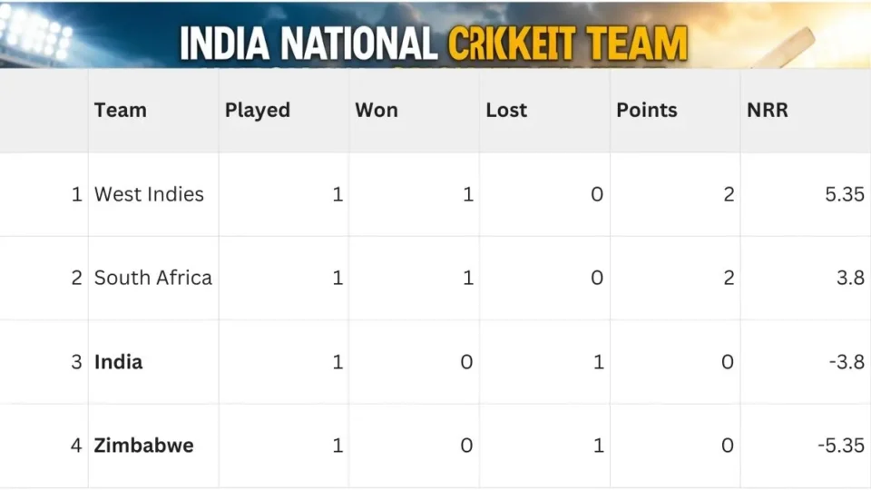The latest standings show West Indies and South Africa leading with 2 points each, while India and Zimbabwe currently sit without points after one match. India’s Net Run Rate (NRR) stands at -3.800, while Zimbabwe’s is -5.350. These numbers may look small, but in tournament cricket, they can decide qualification and eliminate teams faster than you expect.